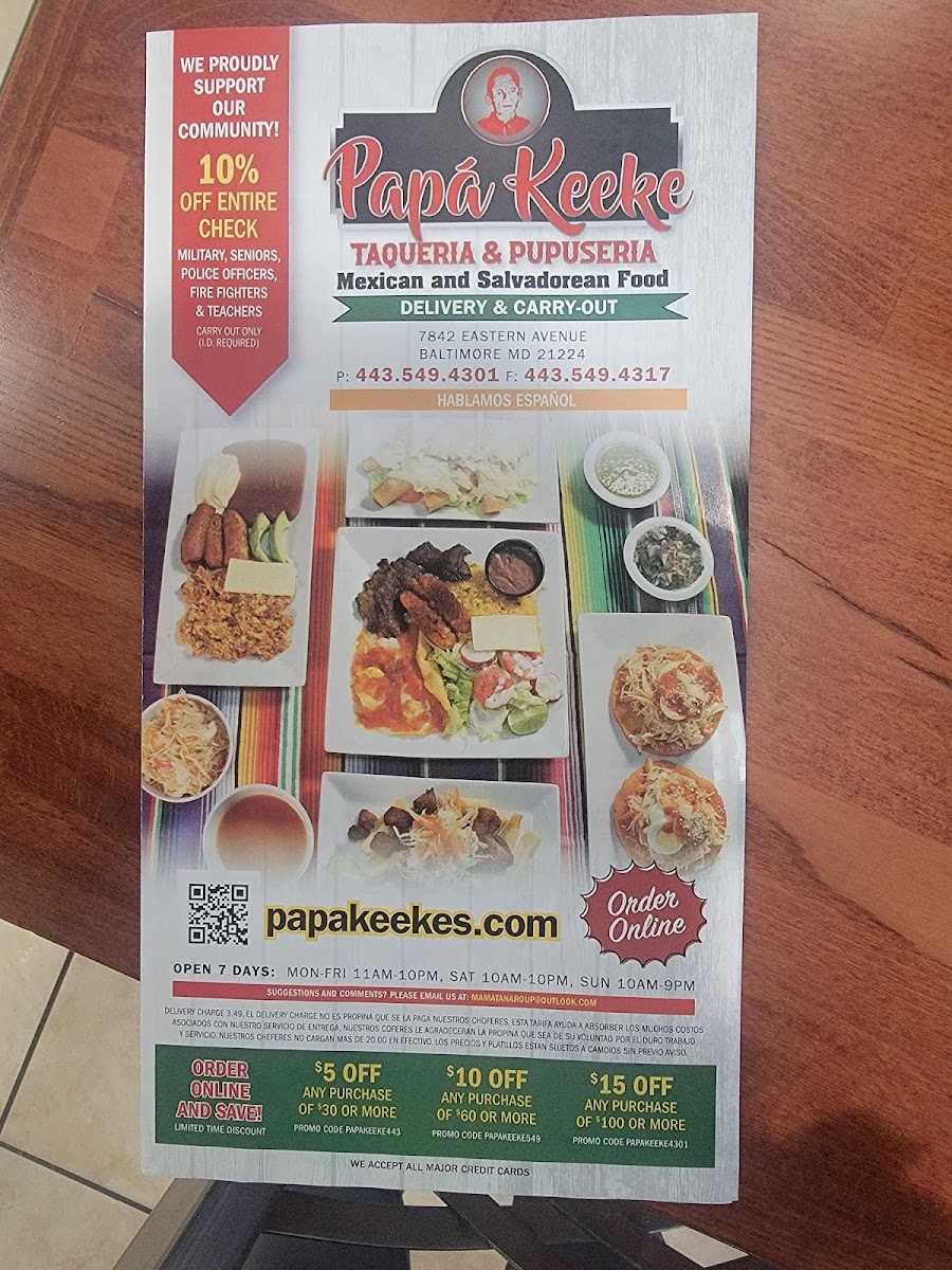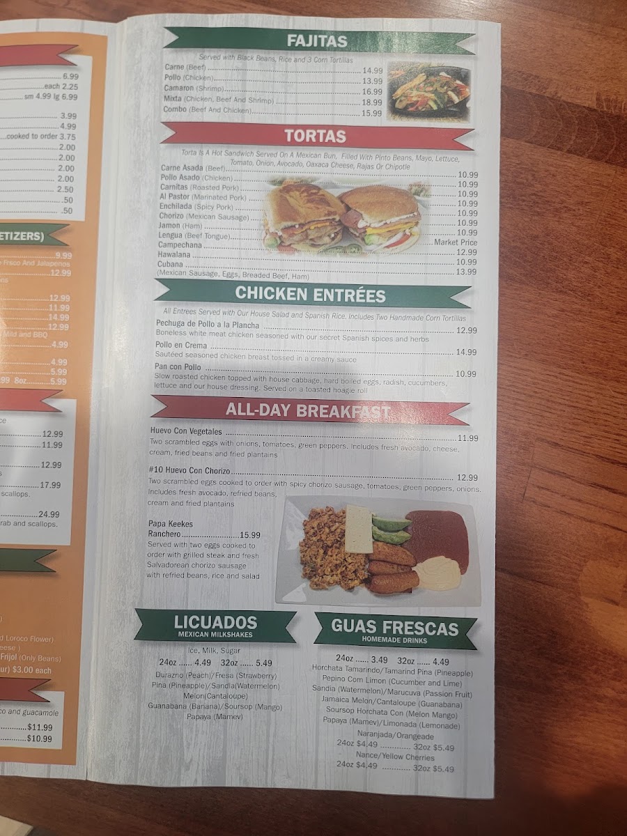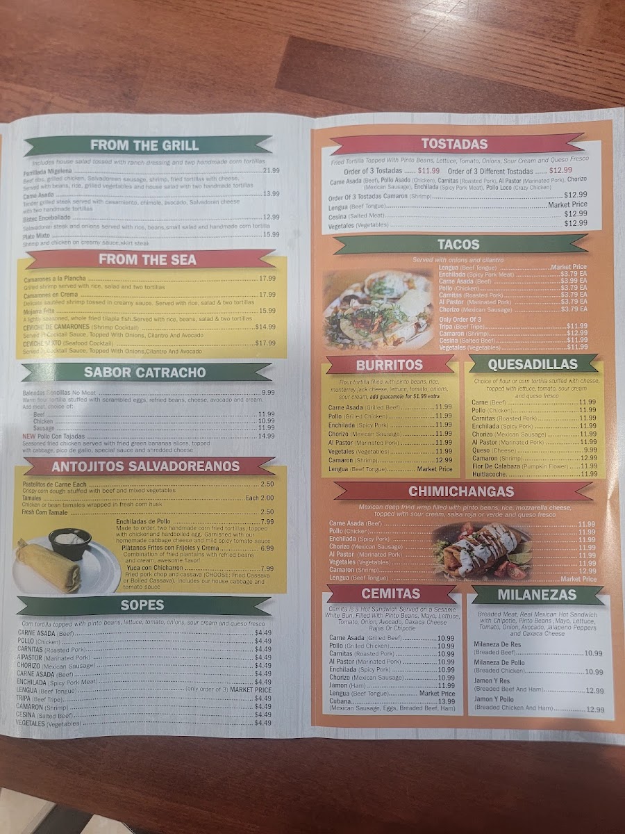 As a final impression of the menu at Papa Keeke’S Taqueria And Pupuseria, it’s clear that this restaurant offers a rich and comforting journey through Latin American flavors, thoughtfully bringing together Mexican, Salvadoran, and Central American classics. The taco selection alone-Tacos De Carne Asada, Tacos De Pollo, Tacos De Lengua, Tacos Al Pastor, and Taquitos Dorados-sets the tone for a menu that values tradition and bold seasoning. Moving into heartier plates, the chicken entrées such as Pechuga De Pollo A La Plancha, Pollo En Crema, Pan Con Pollo, and Choripollo Con Camarones showcase satisfying, home-style cooking. The variety continues with appetizers like Pastelitos De Carne, Tamal De Pollo, Fresh Corn Tamale, and Platanos Fritos Con Frijoles Y Crema, while comforting soups such as Sopa De Res, Sopa De Gallina, Sopa De Mondongo, and Mariscada highlight the kitchen’s depth. Breakfast options like Desayuno #6 Especial, Desayuno #10 Especial Con Chorizo, and Desayuno Migueleño make the menu feel complete at any hour. Signature items including Pupusas Revuelta, Chicharron Con Queso, Baleadas Con Carne, Fajita Mixta, and seafood plates like Mojarra Frita and Camarones En Crema add even more character. Ending on a sweet note with desserts such as Tres Leches, Flan, and Tiramisu, paired with refreshing drinks like Horchata and Tamarindo, the menu feels generous, authentic, and well-rounded-leaving diners with a lasting impression of comfort, variety, and true Latin flavor.
